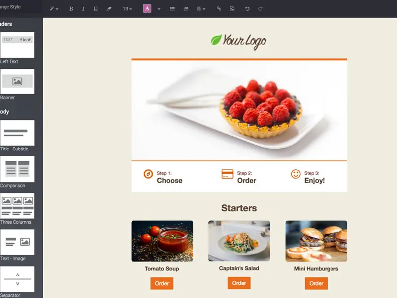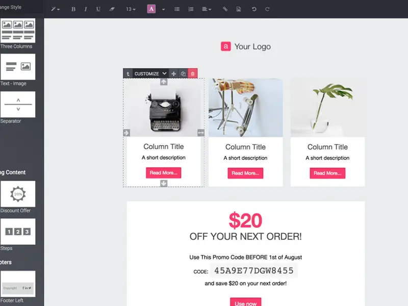 Just choose your building blocks and drop them exactly where you want them to appear on your email. Enrich your content with titles, calls-to-action, social media buttons, or footers in just one click.